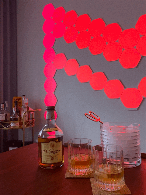 Fun wall art project — designed and installed a custom ‘M’ made out the hexagon Nano Leaf Lights. All of the tiles must be connected in order to work and are able to change colours to the beat of music.